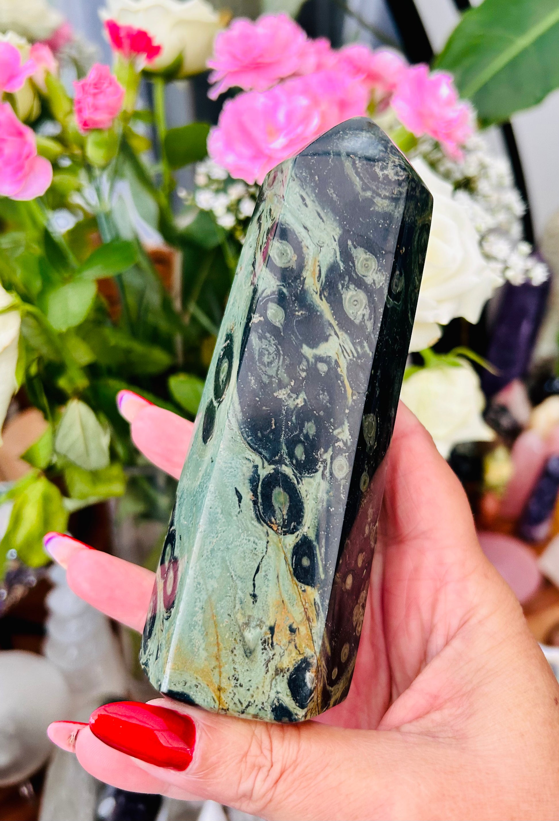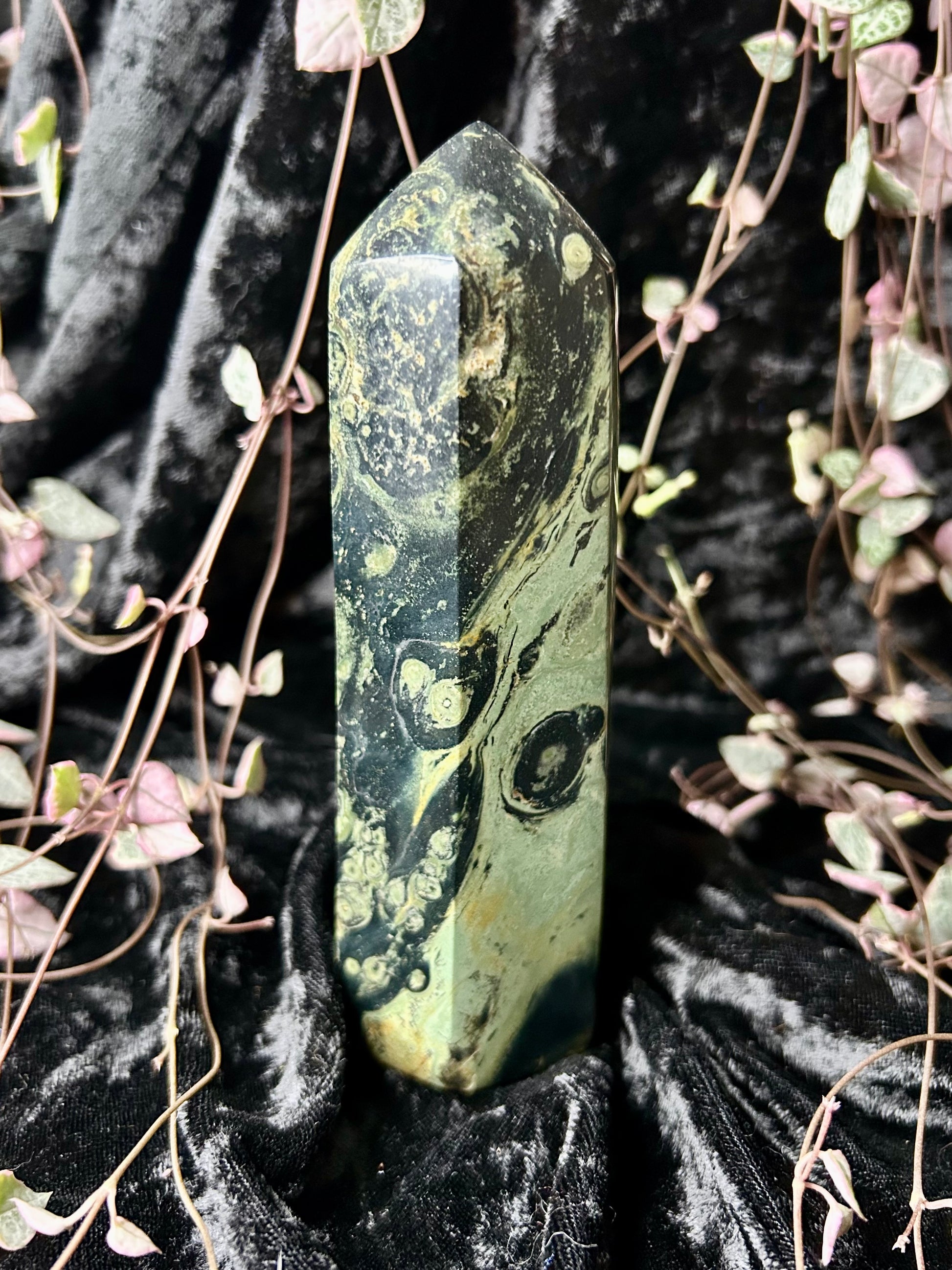 With swirling, primordial patterns of deep green and shadowed black, this Kambaba Jasper tower radiates ancient earth energy. Its presence feels wise, protective, and deeply grounding, a quiet guardian carved from time itself.