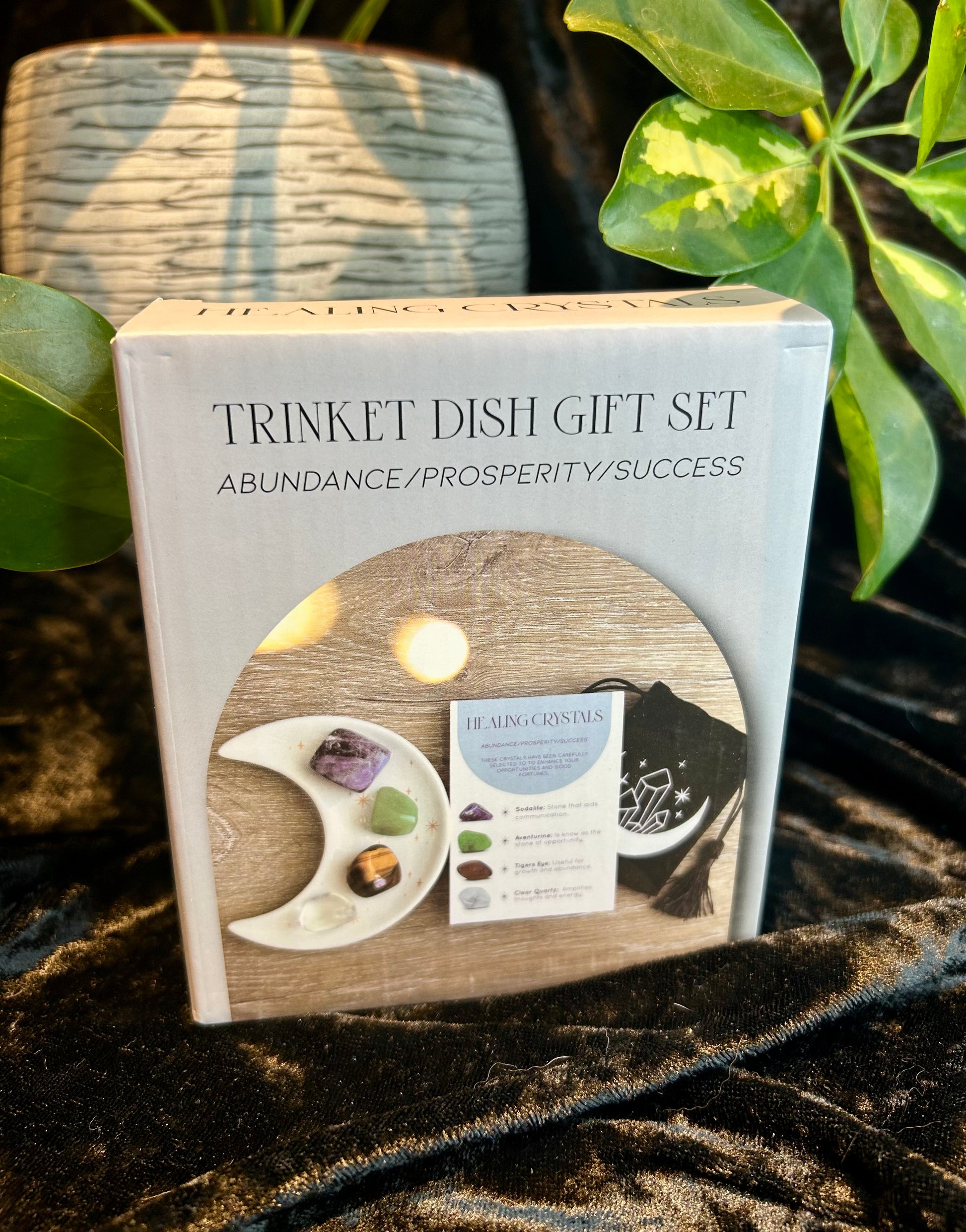Manifest wealth, confidence, and opportunity with this four-stone crystal set, crafted to support success in every form — financial, emotional, and spiritual. Presented with a gorgeous crescent moon trinket dish, a matching info card, and a printed drawstring pouch, it makes the perfect gift for anyone stepping into their power.